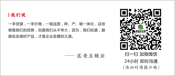 匡老五辣業(yè),近二年專注于地標(biāo)性干辣椒產(chǎn)品經(jīng)營(yíng),公司引進(jìn)多個(gè)非常具有地標(biāo)性特色的干辣椒品種,比如進(jìn)口印度椒、新疆線椒、云南小米椒等,且這些品種在市場(chǎng)中都表現(xiàn)不俗,一經(jīng)上市推廣,便已成為國(guó)內(nèi)熱銷品種。而專注于地標(biāo)性干辣椒,也已成為匡老五辣業(yè)的活招牌。